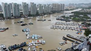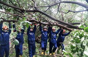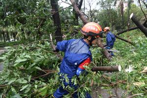 (250825) -- SANYA, 25 agosto, 2025 (Xinhua) -- Miembros de la brigada de incendios y rescate de Sanya, remueven árboles...