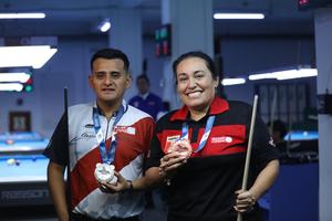 (250825) -- LIMA, 25 agosto, 2025 (Xinhua) -- Imagen del 21 de agosto de 2025 de los billaristas peruanos, Gerson Martínez (i), y Jackeline Pérez (d), posando con sus medallas obtenidas en los Juegos Mundiales de Chengdu 2025, en la Federación Peruana de Billar, en Lima, Perú. Los billaristas peruanos Gerson Martínez y Jackeline Pérez, quienes conquistaron medallas de plata y bronce, respectivamente, en los Juegos Mundiales 2025, celebrados en Chengdu, provincia china de Sichuan, consideraron que esta experiencia fue una oportunidad para explotar su potencial y proyectarse con confianza hacia nuevas competencias internacionales. (Xinhua/Mariana Bazo) (mb) (rtg) (ah) (ce)