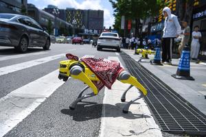 (250828) -- GUIYANG, 28 agosto, 2025 (Xinhua) -- Un perro robot cruza una calle cerca de la sede de la...