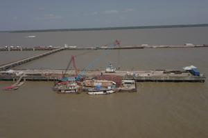 (250827) -- BELEM, 27 agosto, 2025 (Xinhua) -- Vista aérea tomada por un dron el 27 de agosto de 2025 del sitio de construcción de un nuevo puerto para el atraque de buques que servirán como hoteles durante la Conferencia de las Partes (COP30) de la Convención Marco de las Naciones Unidas sobre Cambio Climático, en Belém, estado de Pará, Brasil. (Xinhua/Lucio Tavora) (lt) (jg) (da) (ce)