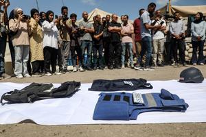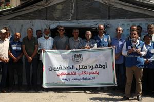 (250826) -- GAZA, 26 agosto, 2025 (Xinhua) -- Manifestantes se reúnen en solidaridad con los periodistas asesinados por los ataques...