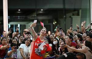 (250827) -- CHIANG MAI, 27 agosto, 2025 (Xinhua) -- Wu Mengjie (frente), de China, posa con aficionados al término del...