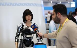 (250829) -- TIANJIN, 29 agosto, 2025 (Xinhua) -- Un reportero extranjero entrevista a un robot humanoide en el centro de...