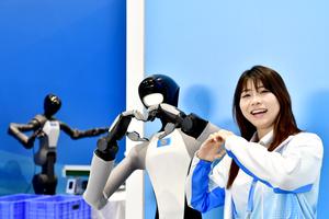 (250829) -- TIANJIN, 29 agosto, 2025 (Xinhua) -- Una voluntaria posa para una fotografía con un robot en el centro...