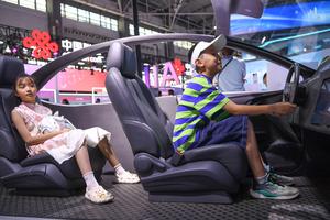 (250828) -- GUIYANG, 28 agosto, 2025 (Xinhua) -- Niños se sientan en una cabina de conducción inteligente con IA durante...