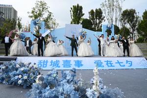 (250829) -- BEIJING, 29 agosto, 2025 (Xinhua) -- Parejas asisten a una boda grupal con motivo del Festival Qixi, en...