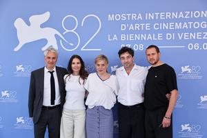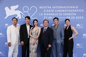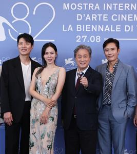 (250829) -- VENECIA, 29 agosto, 2025 (Xinhua) -- El reparto principal de la película "No Other Choice" posa para una...