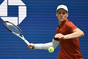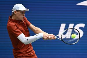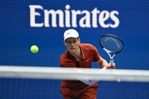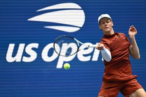 (250829) -- NUEVA YORK, 29 agosto, 2025 (Xinhua) -- Imagen del 28 de agosto de 2025 de Jannik Sinner devolviendo...