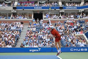 (250829) -- NUEVA YORK, 29 agosto, 2025 (Xinhua) -- Imagen del 28 de agosto de 2025 de Jannik Sinner sirviendo...