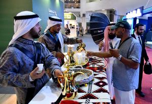 (250829) -- DAMASCO, 29 agosto, 2025 (Xinhua) -- Imagen del 27 de agosto de 2025 de expositores sirviendo café árabe...
