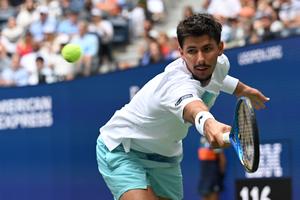 (250829) -- NUEVA YORK, 29 agosto, 2025 (Xinhua) -- Imagen del 28 de agosto de 2025 de Alexei Popyrin devolviendo...