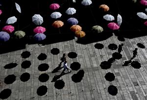 (250828) -- STRUGA, 28 agosto, 2025 (Xinhua) -- Personas caminan en la calle principal decorada con sombrillas, en Struga, Macedonia...