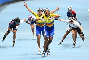 (250815) -- CHENGDU, 15 agosto, 2025 (Xinhua) -- María Fernanda Timms Ariza (d-frente) y Gabriela Rueda (i-frente), de Colombia, festejan...