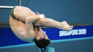 (250803) -- SINGAPUR, 3 agosto, 2025 (Xinhua) -- Randal Willars Valdez, de México, compite durante la final de plataforma de...