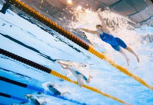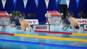 (250803) -- SINGAPUR, 3 agosto, 2025 (Xinhua) -- Ruta Meilutyte (d), de Lituania, compite durante la final de 50m braza...