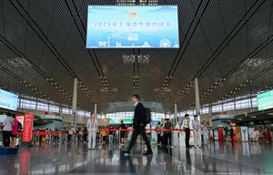 (250830) -- TIANJIN, 30 agosto, 2025 (Xinhua) -- Trabajadoras dan la bienvenida a los invitados en el Aeropuerto Internacional Binhai...