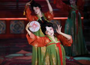 (250829) -- XI'AN, 29 agosto, 2025 (Xinhua) -- Actrices realizan una presentación para mostrar trajes tradicionales en un bloque temático,...