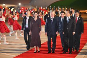 (250830) -- TIANJIN, 30 agosto, 2025 (Xinhua) -- El presidente uzbeko, Shavkat Mirziyoyev, llega para asistir a la Cumbre 2025...