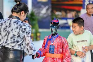 (250829) -- HOHHOT, 29 agosto, 2025 (Xinhua) -- Una visitante estrecha la mano de un robot en la 5 Exposición...