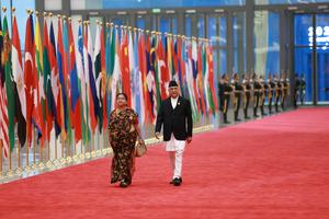 (250831) -- TIANJIN, 31 agosto, 2025 (Xinhua) -- El primer ministro nepalí, KP Sharma Oli, y su esposa llegan al...