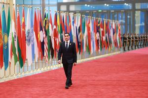 (250831) -- TIANJIN, 31 agosto, 2025 (Xinhua) -- El presidente turcomano, Serdar Berdimuhamedov, llega al Centro de Convenciones y Exposiciones...