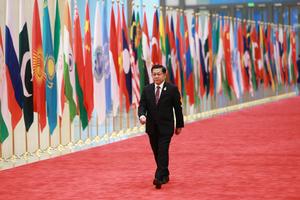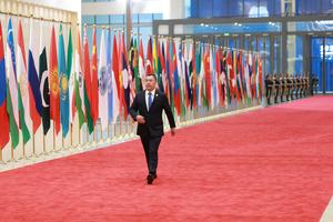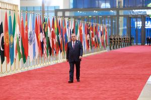 (250831) -- TIANJIN, 31 agosto, 2025 (Xinhua) -- El presidente tayiko, Emomali Rahmon, llega al Centro de Convenciones y Exposiciones...
