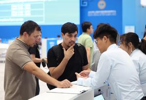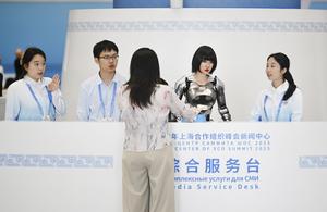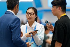 (250831) -- TIANJIN, 31 agosto, 2025 (Xinhua) -- Una voluntaria brinda servicios de lenguaje para un periodista extranjero en el...