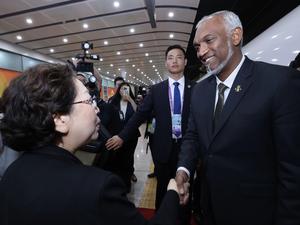 (250901) -- BEIJING, 1 septiembre, 2025 (Xinhua) -- El presidente maldivo, Mohamed Muizzu, llega a Beijing, capital de China, el...