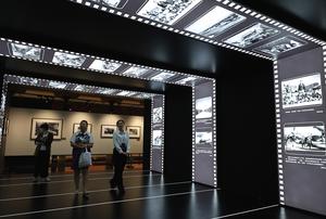 (250901) -- SHANGHAI, 1 septiembre, 2025 (Xinhua) -- Personas visitan una exposición de arte que destaca la Guerra de Resistencia...