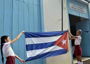 (250901) -- LA HABANA, 1 septiembre, 2025 (Xinhua) -- Alumnas de primaria sostienen una bandera nacional cubana que será izada...