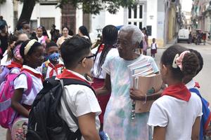 (250901) -- LA HABANA, 1 septiembre, 2025 (Xinhua) -- Una maestra conversa con estudiantes de primaria previo a entrar a...
