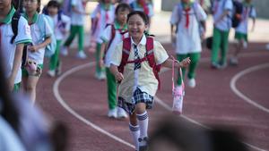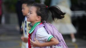 (250901) -- GUIYANG, 1 septiembre, 2025 (Xinhua) -- Una estudiante llega a una escuela primaria, en Guiyang, en la provincia...