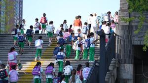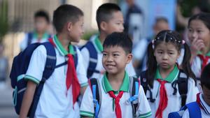 (250901) -- GUIYANG, 1 septiembre, 2025 (Xinhua) -- Estudiantes llegan a una escuela primaria, en Guiyang, en la provincia de...