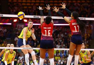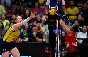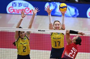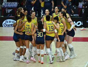 (250901) -- BANGKOK, 1 septiembre, 2025 (Xinhua) -- Imagen del 31 de agosto de 2025 de jugadoras de Brasil festejando...