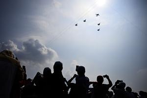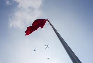 (250903) -- BEIJING, 3 septiembre, 2025 (Xinhua) -- El escalón de aviones de alerta temprana y comando sobrevuela la Plaza...