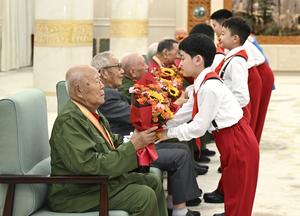 (250903) -- BEIJING, 3 septiembre, 2025 (Xinhua) -- Miembros de los Jóvenes Pioneros Chinos entregan flores a los veteranos de...