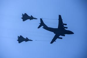 (250903) -- BEIJING, 3 septiembre, 2025 (Xinhua) -- El escalón aéreo de aviones cisterna y receptor asiste a un desfile...