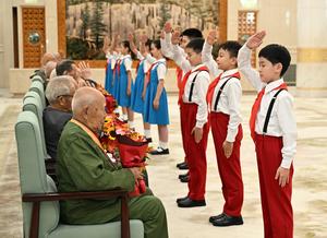 (250903) -- BEIJING, 3 septiembre, 2025 (Xinhua) -- Miembros de los Jóvenes Pioneros Chinos entregan flores a los veteranos de...
