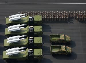 (250903) -- BEIJING, 3 septiembre, 2025 (Xinhua) -- La formación de misiles antibuque asiste a un desfile militar, en Beijing,...