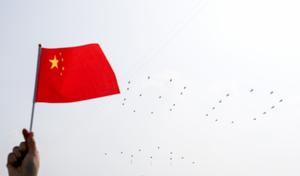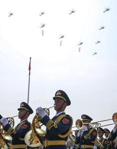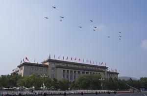 (250903) -- BEIJING, 3 septiembre, 2025 (Xinhua) -- El escalón aéreo de guardia de la bandera sobrevuela la Plaza Tian'anmen...