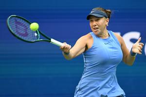 (250904) -- NUEVA YORK, 4 septiembre, 2025 (Xinhua) -- Imagen del 3 de septiembre de 2025 de Amanda Anisimova devolviendo...