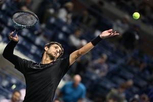 (250904) -- NUEVA YORK, 4 septiembre, 2025 (Xinhua) -- Imagen del 3 de septiembre de 2025 de Lorenzo Musetti sirviendo...