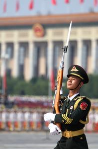 (250902) -- BEIJING, 2 septiembre, 2025 (Xinhua) -- Un guardia del desfile marcha en el sitio durante una gran concentración...
