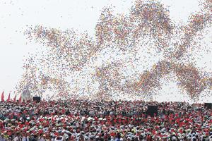 (250902) -- BEIJING, 2 septiembre, 2025 (Xinhua) -- Globos son lanzados durante una gran concentración para conmemorar el 80° aniversario...