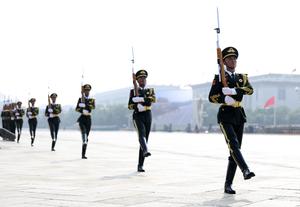 (250902) -- BEIJING, 2 septiembre, 2025 (Xinhua) -- Guardias del desfile marchan en el sitio durante una gran concentración para...