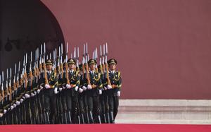 (250902) -- BEIJING, 2 septiembre, 2025 (Xinhua) -- Guardias del desfile se colocan en posición previo a una gran concentración...