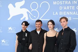 (250902) -- VENECIA, 2 septiembre, 2025 (Xinhua) -- El reparto principal de la película "L'Etranger", posa para una sesión fotográfica...