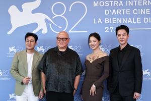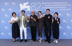 (250905) -- VENECIA, 5 septiembre, 2025 (Xinhua) -- Cai Shangjun (2-i), director de la película "The Sun Rises On Us...