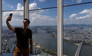 (250905) -- SEUL, 5 septiembre, 2025 (Xinhua) -- Un visitante se toma fotografías mientras visita el observatorio Seoul Sky de...