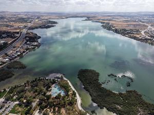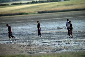 (250905) -- ANKARA, 5 septiembre, 2025 (Xinhua) -- Personas caminan sobre el lecho seco del lago Mogán, en Ankara, Turquía,...